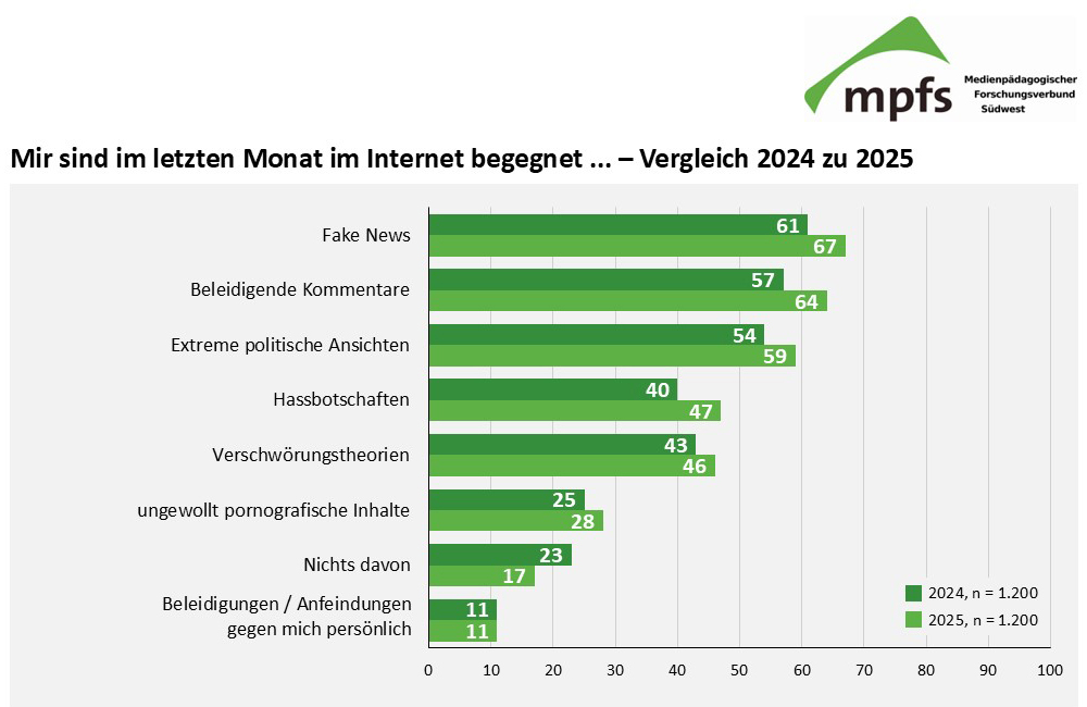 Parallel dazu steigt die Zahl der Risiko- und Belastungserfahrungen im Netz. Innerhalb von drei Jahren hat der Kontakt mit Fake News, Hassrede, extremistischen Inhalten und sexualisierter Belästigung kontinuierlich zugenommen. Dieser Befund ist nicht nur ein Warnsignal, sondern verdeutlicht die Dringlichkeit, Medienkompetenzförderung und Schutzmechanismen weiter zu stärken.